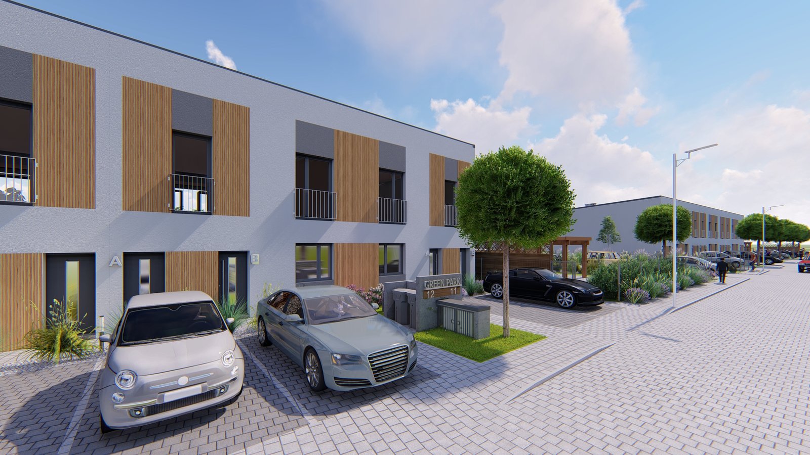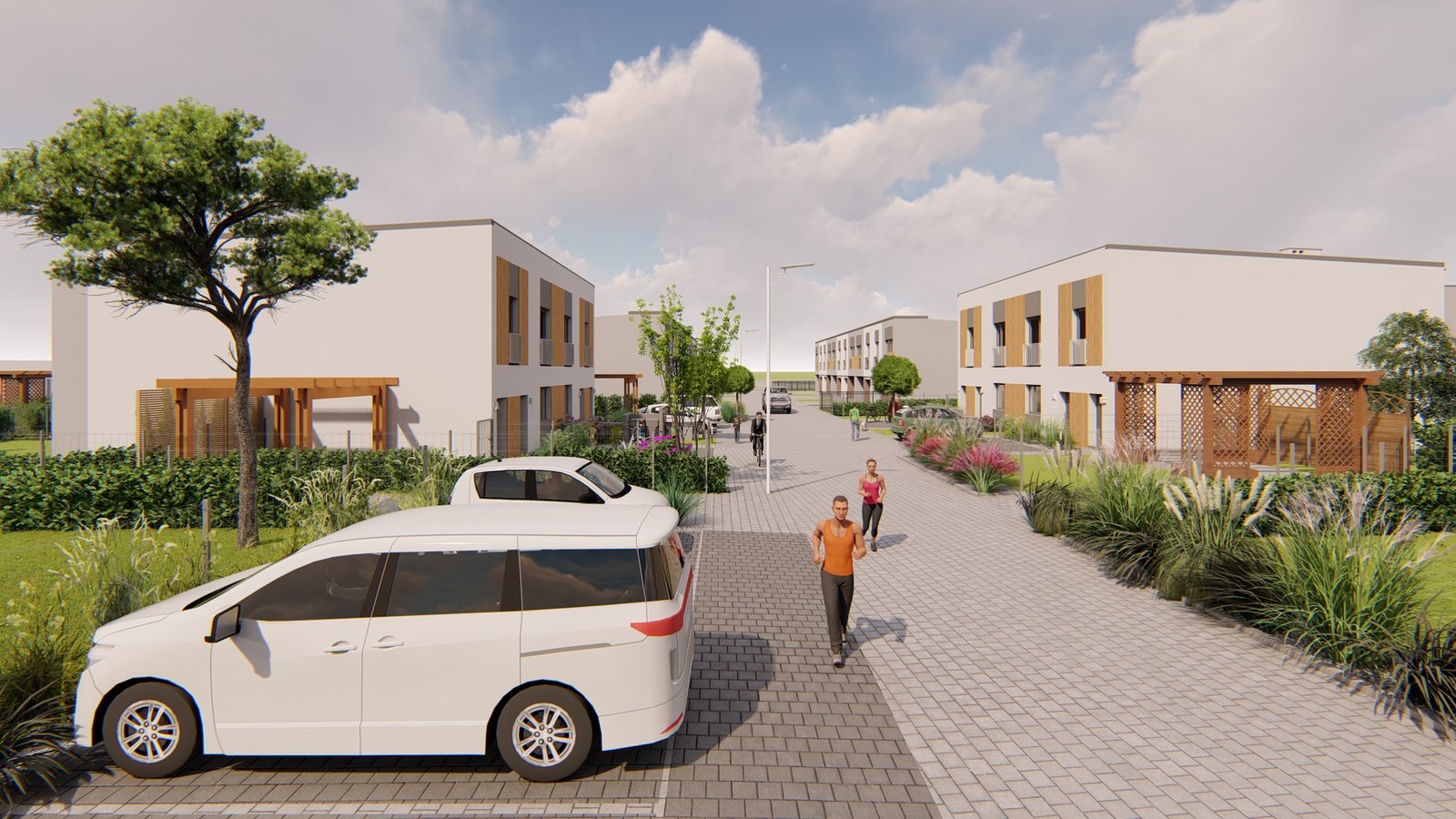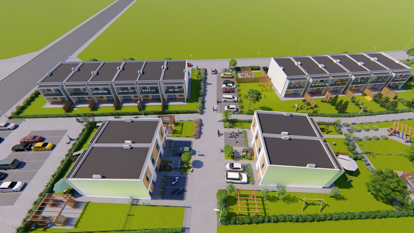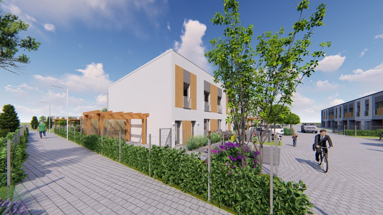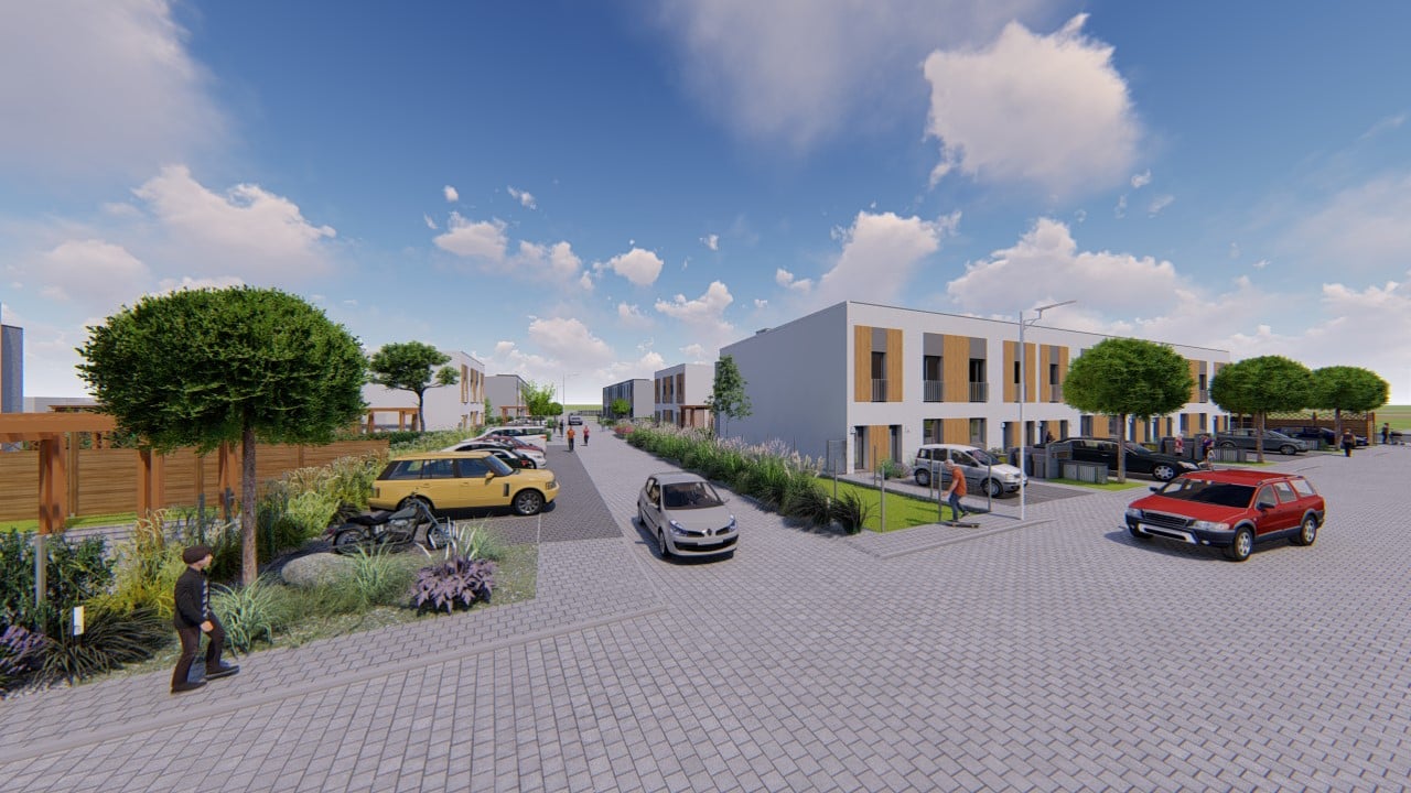 W 16 budynkach jednorodzinnych dwulokalowych projektuje się wykonanie 32 mieszkań wraz z przydomowymi ogrodami dla lokali znajdujących się na parterze budynku, jak i dla kilku lokali z I piętra, z których każdy dodatkowo posiada balkon. Na terenie osiedla zaprojektowano 74 miejsca postojowe.